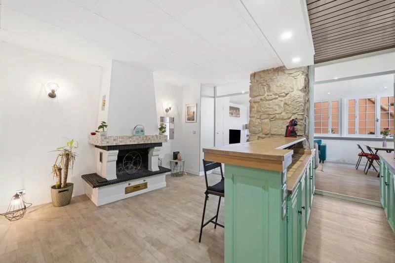 The kitchen, open to the living room, seduces with its contemporary design and convivial spirit. Its wooden bar adds a warm, natural touch, perfect for sharing a moment over a drink.